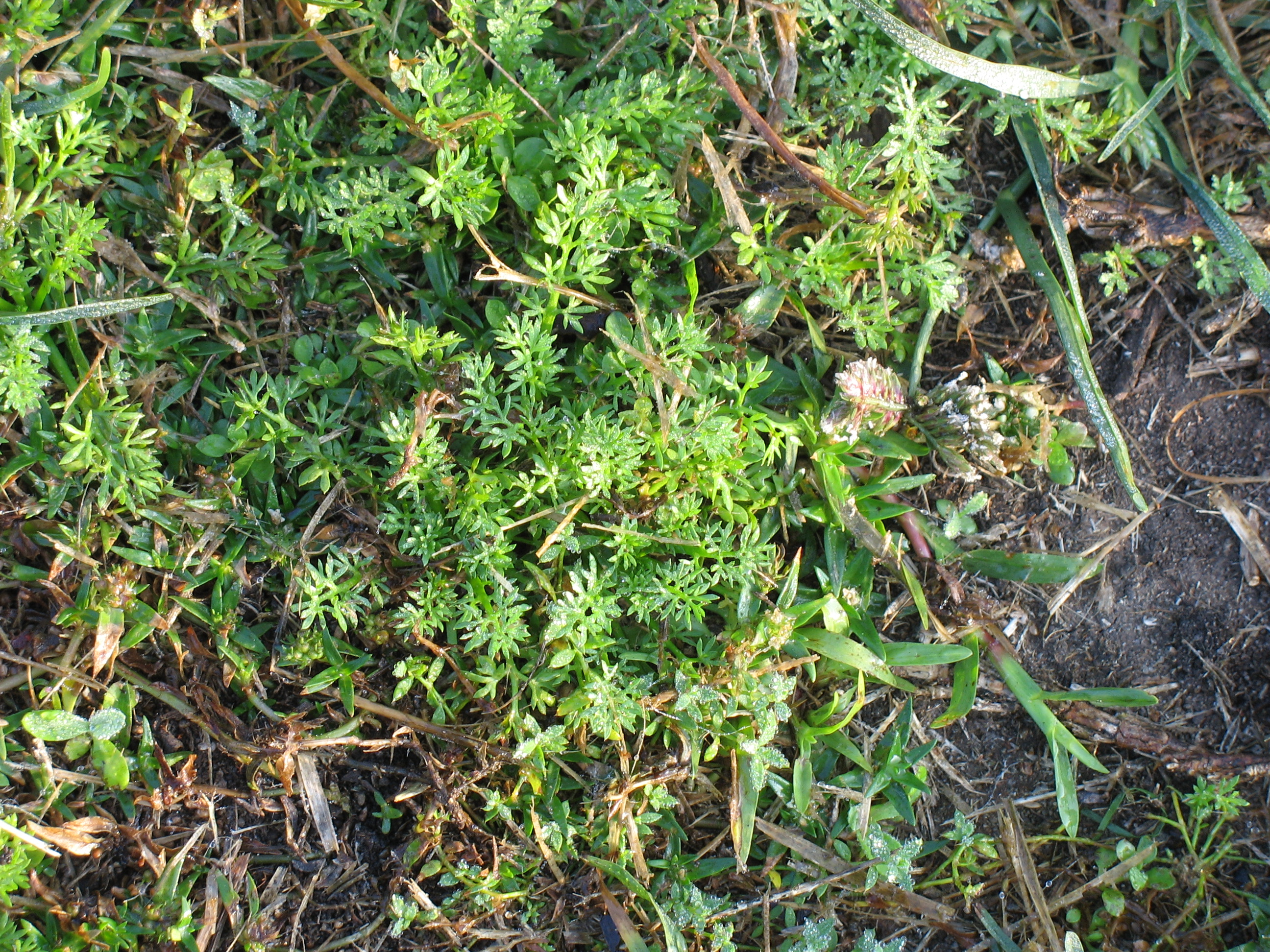 BindiiScientific Name:Soliva sessilis What is Bindii?Bindii is a winter annual weed that grows low to the ground in a rosette-forming pattern. It is known for spreading outward by rooting at its nodes, which helps it form multiple rosettes and quickly take over thin or stressed turf areas. Its leaves are small, green and resemble carrot foliage, but are clustered tightly around the centre of the rosette. From this centre, the plant produces a compact seed head made of sharp, tapered seeds. These seeds stay soft and fairly inconspicuous through winter, but by spring they harden into painful prickles, making bindii a major nuisance for turf areas and anyone walking barefoot on lawn surfaces. Although most people only notice bindii once the prickles appear, early intervention is key treating the plant before the seeds harden offers the best control results. Signs of Damage & What It Does to TurfYou may be dealing with Bindii if you observe: