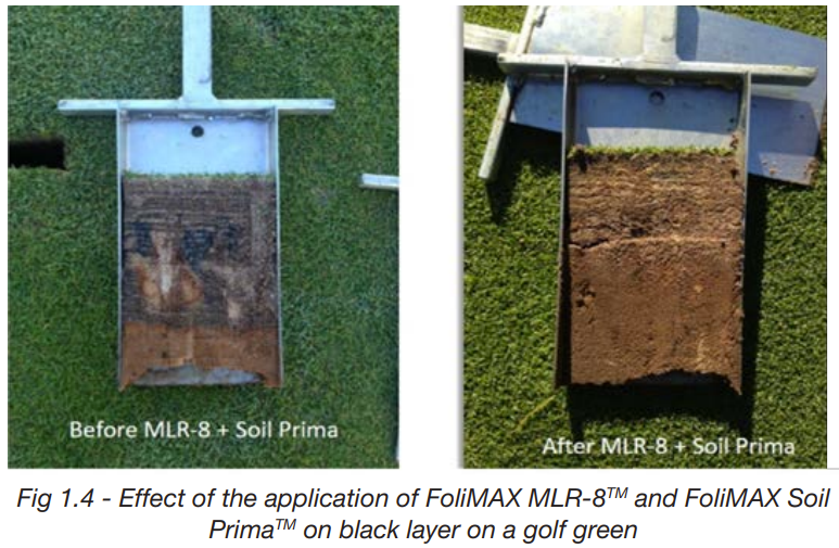 FoliMAX Soil Prima™ is a modified potassium humate (patent protected process) that acts as a complexing agent to mobilise soil nutrients in forms that are readily plant available. FoliMAX Soil Prima™ provides a complex energy source (500 calories per gram) to accelerate microbial activity, in turn increasing organic matter breakdown and nutrient cycling. The recycling of thatch and mat creates a more friable soil layer, enabling water to drain more freely and aiding the flushing of sulphur build-ups – black layer again!