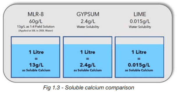 FoliMAX MLR-8™ contains complex sugars and organic acids that act as a food source for soil biology needed to continue processing organic matter. The organic compounds in FoliMAX MLR-8™ make other nutrients more bio available to plants and provide an energy source for soil biota, especially the fungi that are responsible for the stimulation of nitrifying bacteria which leads to increased utilisation of soil nitrogen. Several studies have shown a reduction in diseases like pythium, when similar sugar compounds are applied. As you can see, you are doing more than simply adding calcium.