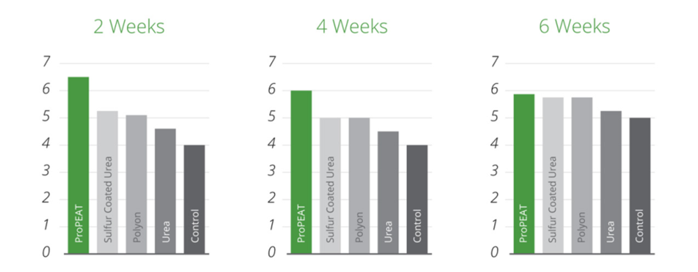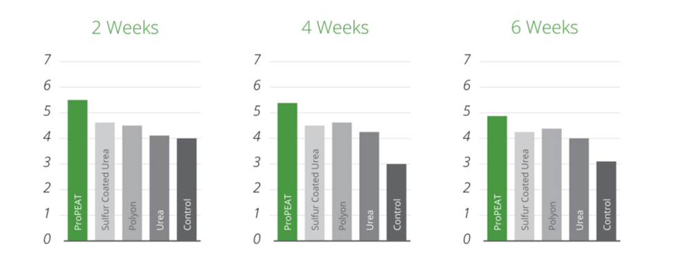 Throughout the trial period, turf plots receiving the ProPEAT treatment consistently displayed the darkest green colour and the best overall growth based on observations. The visual quality of the plots receiving the ProPEAT application also exhibited an improved quality over all other treatments throughout the duration of the study. Based on these trials, the steady and reliable nutrient-release characteristics of the ProPEAT Carbon90Plus technology could be an exciting option for turf managers seeking visually appealing and healthy turf.